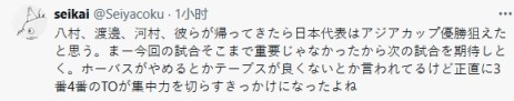 如果八村、渡边、河村都在的话,我认为日本男篮很有机会赢得亚洲杯。不过这次比赛并不算特别重要,所以还是期待下一次比赛的表现。虽然有人议论霍瓦斯可能辞职,或者有人状态不佳。但说真的,连续失误确实影响了球员们的心态。