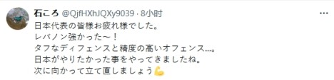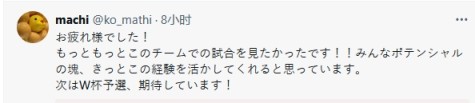 虽然没能达成目标,感到有些遗憾,但还是辛苦了。期待每个人都能继续成长,在世界杯预选赛中为之前的失利复仇。