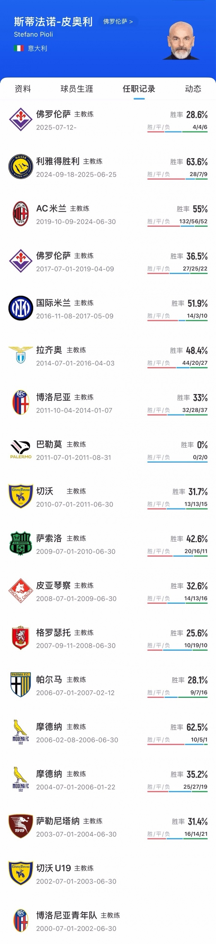 11月4日讯 官方消息,在本赛季意甲开局10轮不胜后,60岁的佛罗伦萨主帅皮奥利宣告下课。