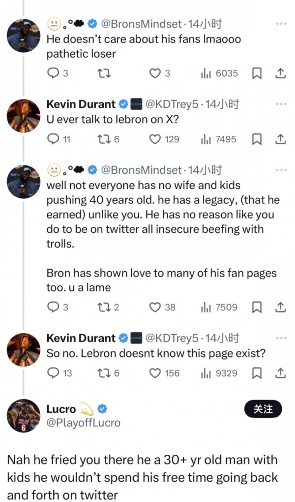 球迷A:“并不是每个人都是快40岁还没有妻儿。他有着自己辛勤建立的传奇,不像你。他没有必要像你一样在推特上和喷子们争吵不休。勒布朗也经常向他的许多粉丝主页表达爱意。你真是个失败者。”