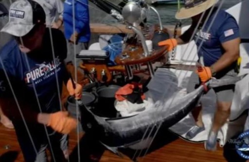 目前乔丹和他的团队钓到了一条重达71磅(32公斤)的白马林鱼,目前位居第二。