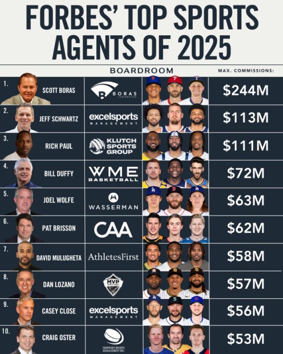 25年体育经纪人佣金榜:富保罗仅第三!MLB传奇经纪人2.44亿