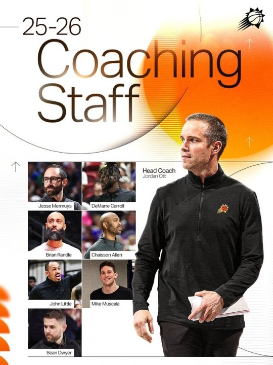 太阳公布25-26赛季教练组名单:奥特主教练+穆斯卡拉等7位助教