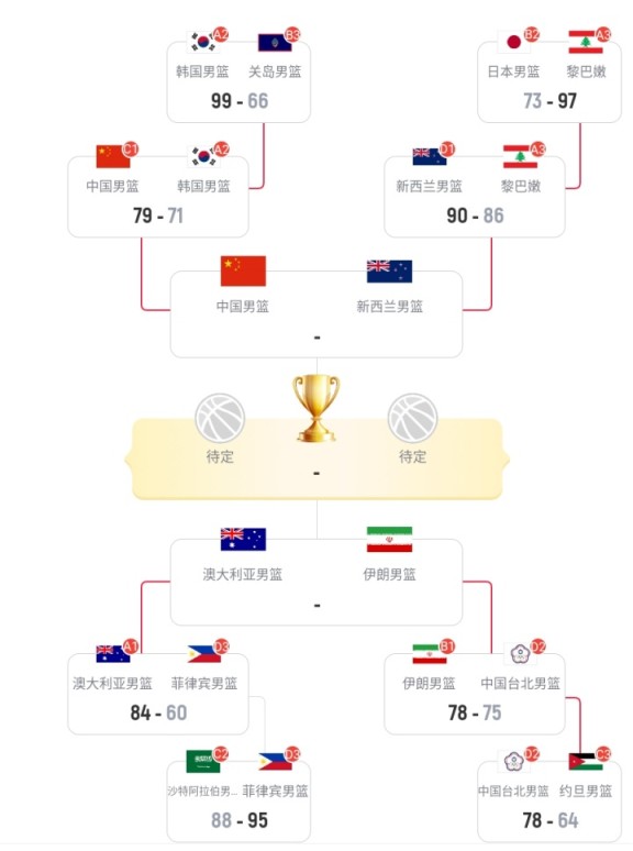 至此,亚洲杯4强全部出炉,4个小组第一完成会师。两场半决赛的对阵分别为:澳大利亚vs伊朗、中国vs新西兰(上届季军)。