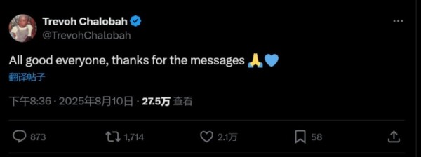 在热身赛中崴脚,查洛巴报平安:一切安好,感谢大家的留言