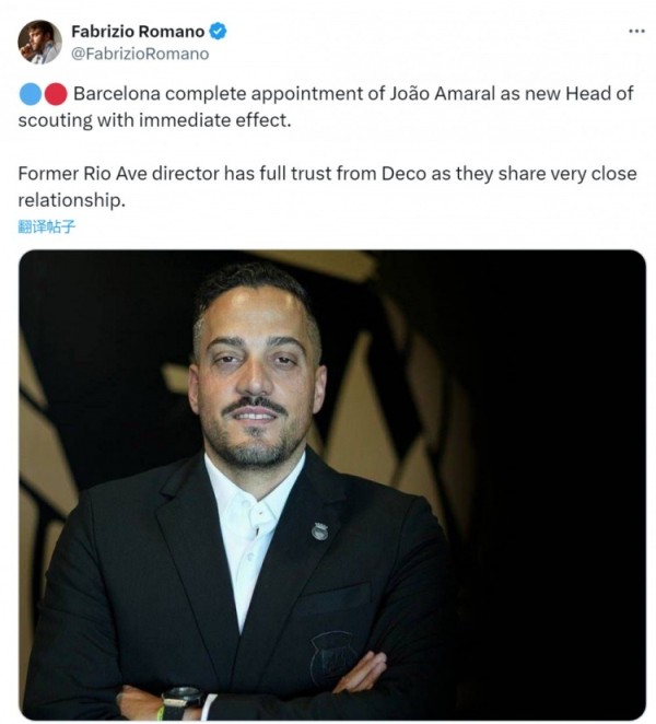 罗马诺透露,阿马拉尔成为巴萨新任球探主管,这一任命已经完成,立即生效。巴萨总监德科非常信任阿马拉尔,两人关系密切。