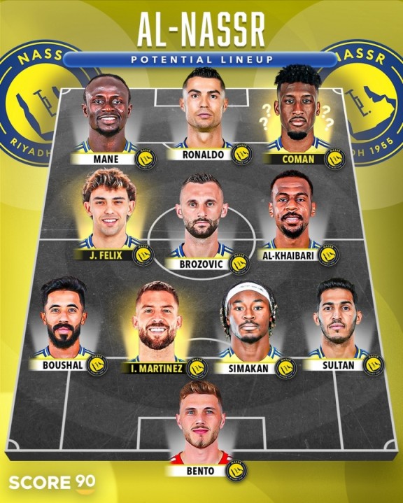 和新月碰一碰!胜利新赛季首发:C罗+马内+科曼+菲利克斯+伊尼戈