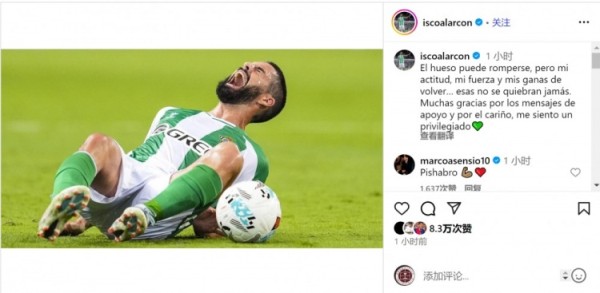 伊斯科社媒写道:“骨头可能断裂,但我的态度、力量和回归的决心……这些永远不会动摇。非常感谢大家的鼓励信息和关爱,这让我感到非常幸运。”