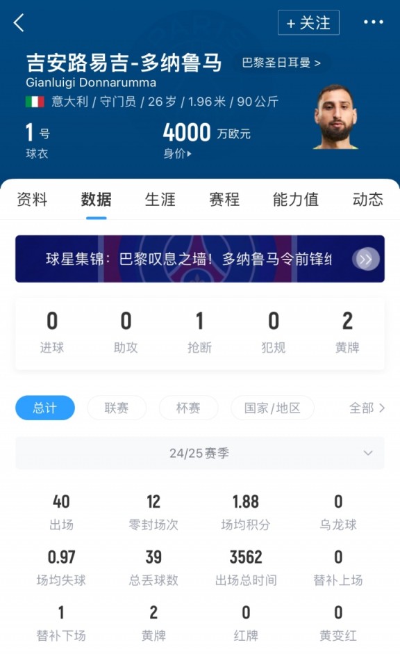 多纳鲁马2021年从米兰自由转会至巴黎,上赛季为巴黎出场40次,取得12场零封,场均失球0.97个,目前其德转身价为4000万欧。