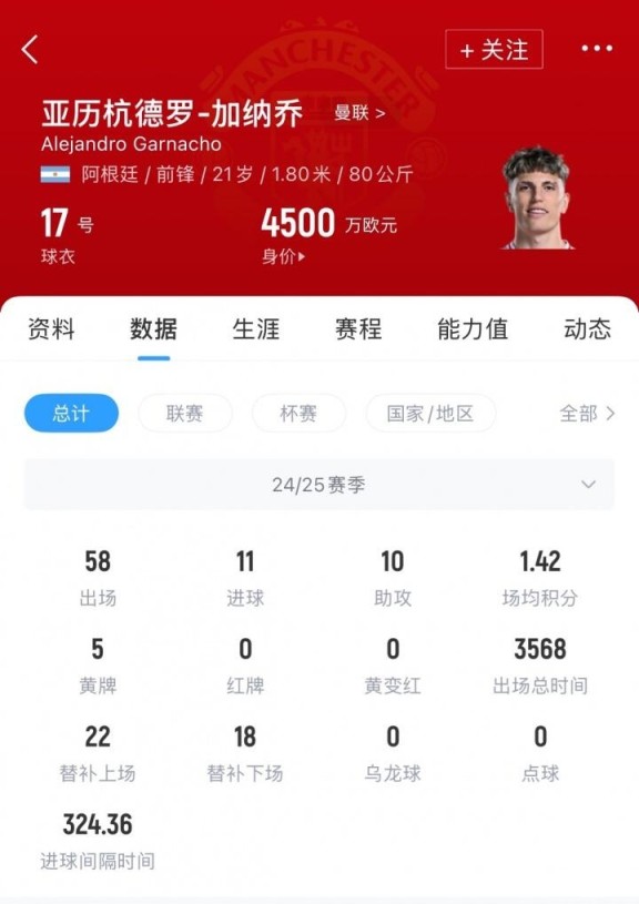 加纳乔现年21岁,上赛季各赛事出场58次,贡献11球10助。目前球员德转身价为4500万欧元。