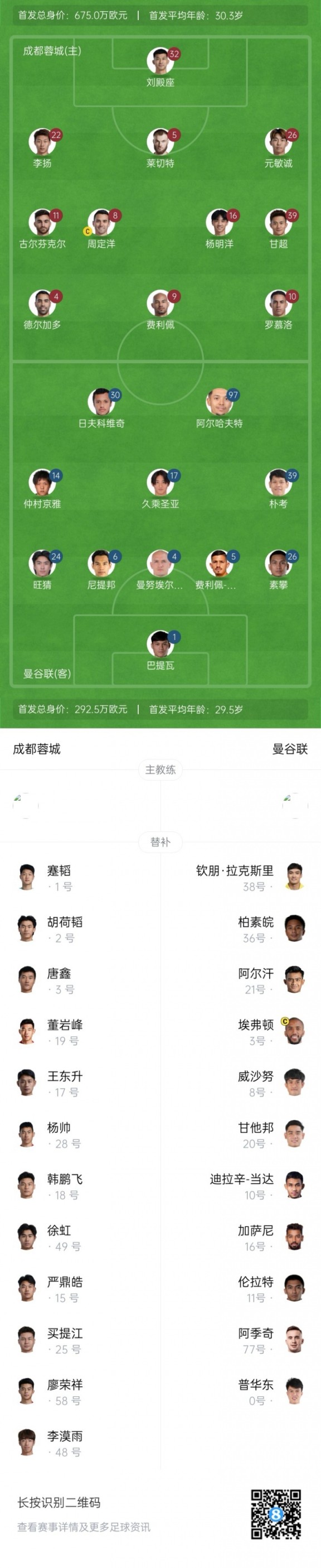 回来了!胡荷韬进蓉城vs曼谷联替补名单,此前国足18强赛左膝受伤