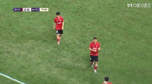 比赛第78分钟,蓉城队换人调整,吃到黄牌的杨明洋和李扬被董岩峰和严鼎皓替换下场。