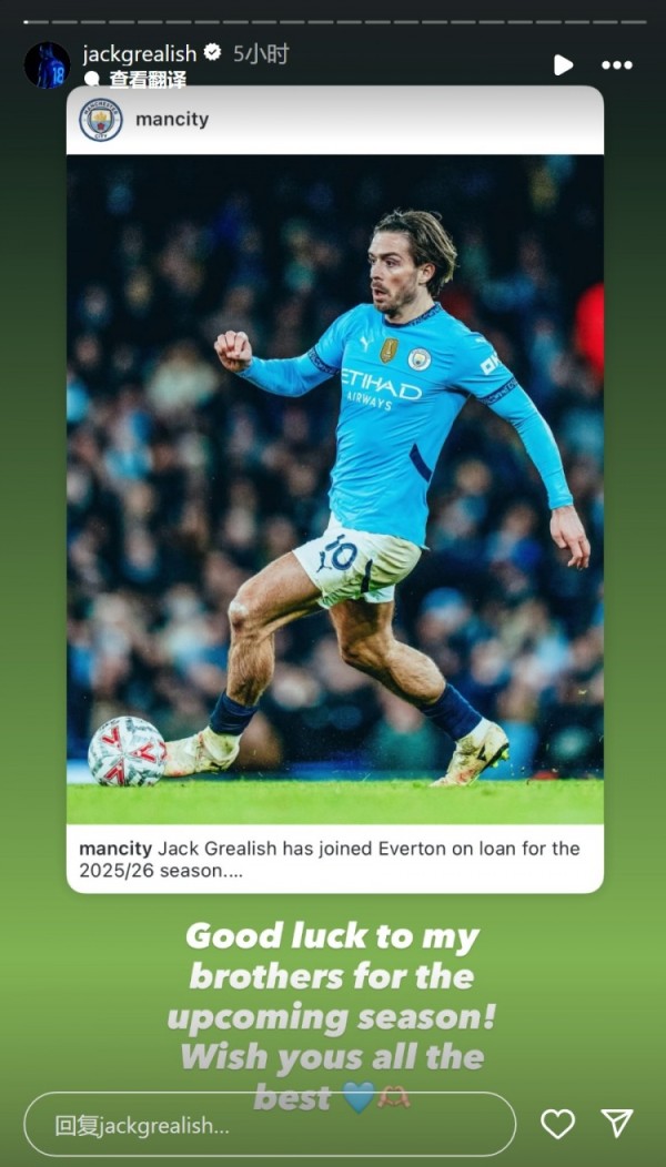 格拉利什社媒转发曼城的官宣动态,并配文:“祝我的兄弟们新赛季好运,一切顺利!”