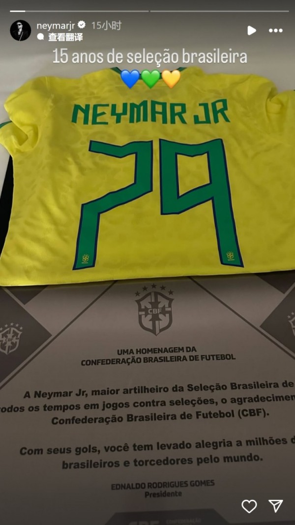 内马尔社媒晒出国家队79球纪念球衣,以及足协向他致敬的奖章,配文:“巴西国家队首秀15周年。”