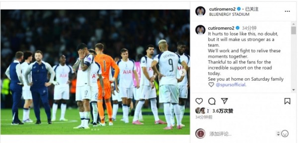 热刺队长罗梅罗社媒晒出赛后失落的照片,配文:“毫无疑问,以这样的方式输球令人痛苦,但这会让我们作为一支球队变得更强大。我们会努力拼搏,一起重现争冠时刻。