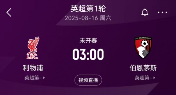 8月16日凌晨3:00,英超卫冕冠军利物浦将主场迎战伯恩茅斯。