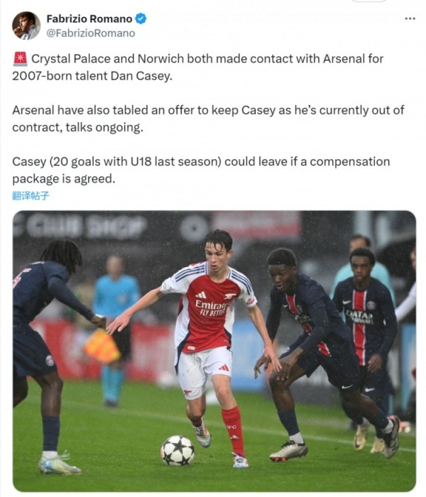 罗马诺透露,水晶宫和诺维奇都已与阿森纳接触,商谈丹-凯西交易的补偿金问题。阿森纳也已提出续约报价,以留住目前合同到期的丹-凯西,谈判仍在进行之中。