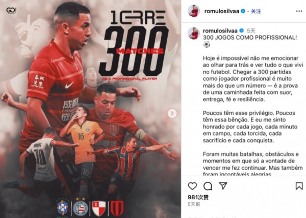 罗慕洛配文写道:“职业生涯出战300场!毫无疑问这很难不让人激动,回首望去,作为职业球员能够完成300次出场,对我而言这不仅仅是数字,更是一段由汗水、奉献、信念与坚韧交织而成的旅途。”
