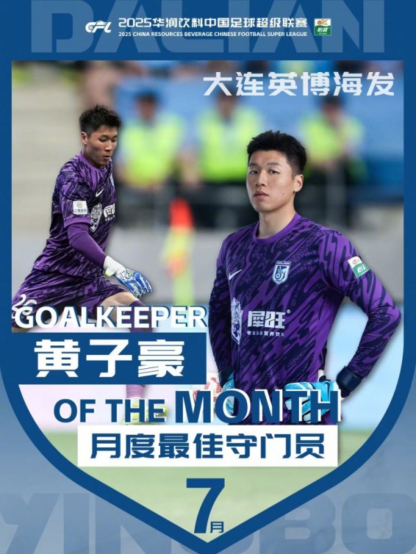 两场比赛扑救成功率100%!官方:黄子豪获中超7月份最佳门将