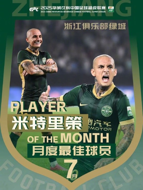在中超联赛7月份的赛事中,浙江队两战全胜,夏窗新加盟球队的罗马尼亚外援米特里策合计打入3球,两场比赛均拿到了全场最佳。米特里策先是在对阵云南玉昆的比赛中完成梅开二度,又在对阵武汉三镇的比赛中上演补时绝杀。