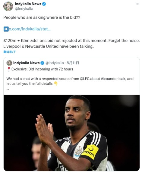 被球迷戏称为“绿帽哥”的indykaila News再爆猛料:利物浦已经1.2亿镑+500万浮动报价伊萨克,目前纽卡尚未拒绝这份新的报价。